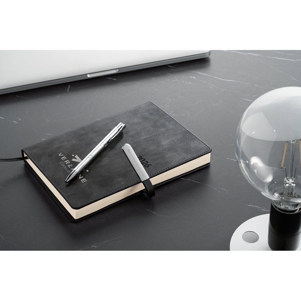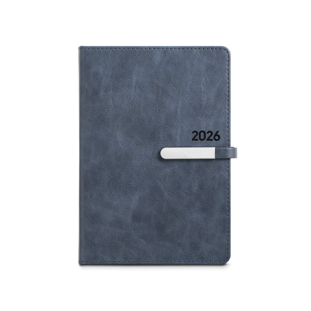 Agenda A5 em PU, com fecho magnético e peça metálica brilhante. Possui um suporte para esferográfica (inclusa) e marcador em fita. Está organizada num plano diário (70 g/m²). Fornecida com bolsa de non-woven. 148 x 210 mm | Bolsa: 205 x 250 mm
