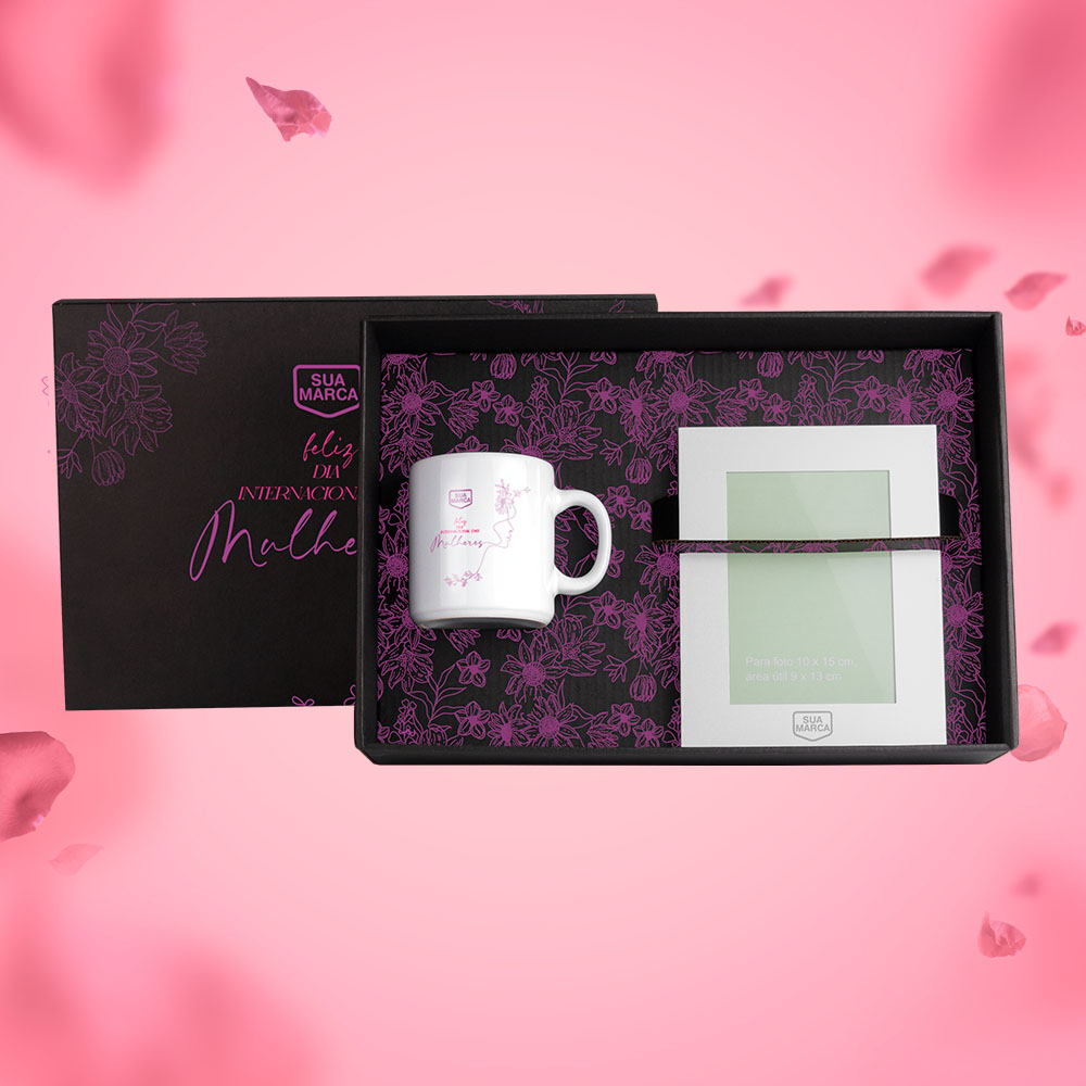 Sugestão de PersonalizaçãoUma gravação em Silk-Screen na caneca e na tampa da caixa; Laser no porta-retrato.